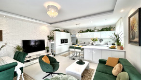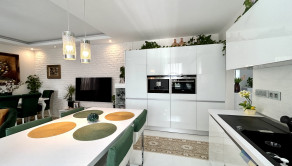 Celý byt je vybavený kvalitným nábytkom a krásnou kuchynskou linkou so značkovými zabudovanými spotrebičmi. Samozrejmosťou je optický internet.