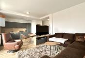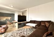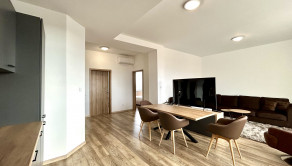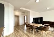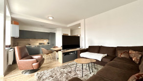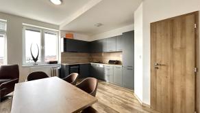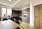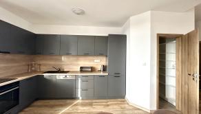 Kuchynská linka s indukčnou varnou doskou je vybavená všetkými potrebnými vstavanými spotrebičmi. Obývacia izba a kuchynská časť je predelená jedálenským stolom.
