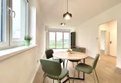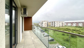 Pozdĺž celého bytu je loggia s elegantným riešením zábrany s priehľadného tvrdeného skla.