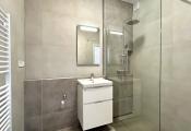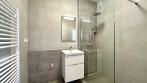 V kúpeľni so sprchovým kútom je okrem rebríkového radiátora inštalované aj podlahové kúrenie.