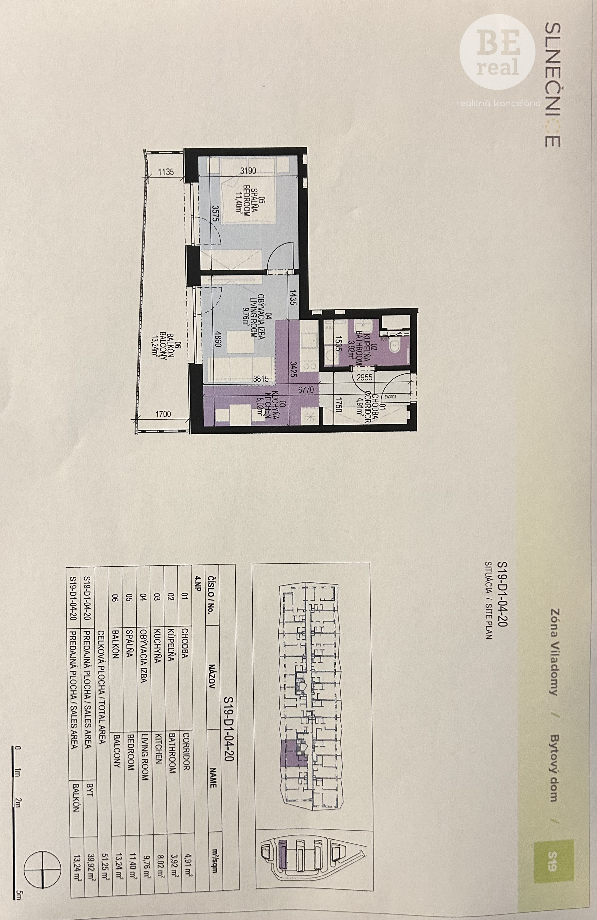 Celková úžitková plocha nehnuteľnosti je 53,16 m2 (byt 39,92 m2 + loggia 13,24 m2) a nachádza sa na 3. poschodí 6. poschodvého bytového domu na Fialovej ulici č.7/B